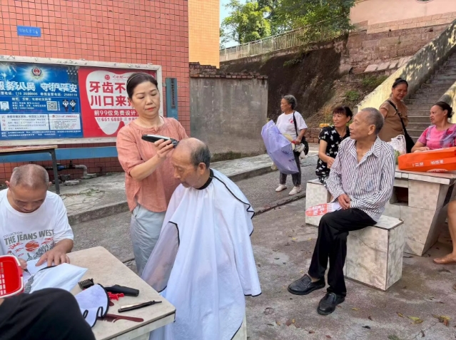 理发志愿者耐心细致地询问居民需求,一边修剪头发,一边与居民亲切交谈,理完发的居民个个精神焕发。