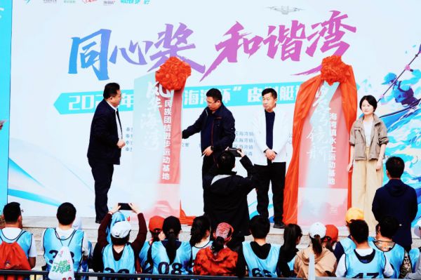 海湾镇党委副书记、镇长高晓峰一同为海湾镇“民族团结进步运动基地”揭牌。与此同时,奉贤区体育局党组成员、副局长杨洁兵,海湾镇党委委员、副镇长高洁一同为海湾镇“水上运动基地”揭牌。